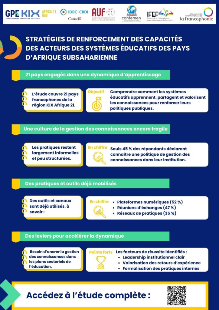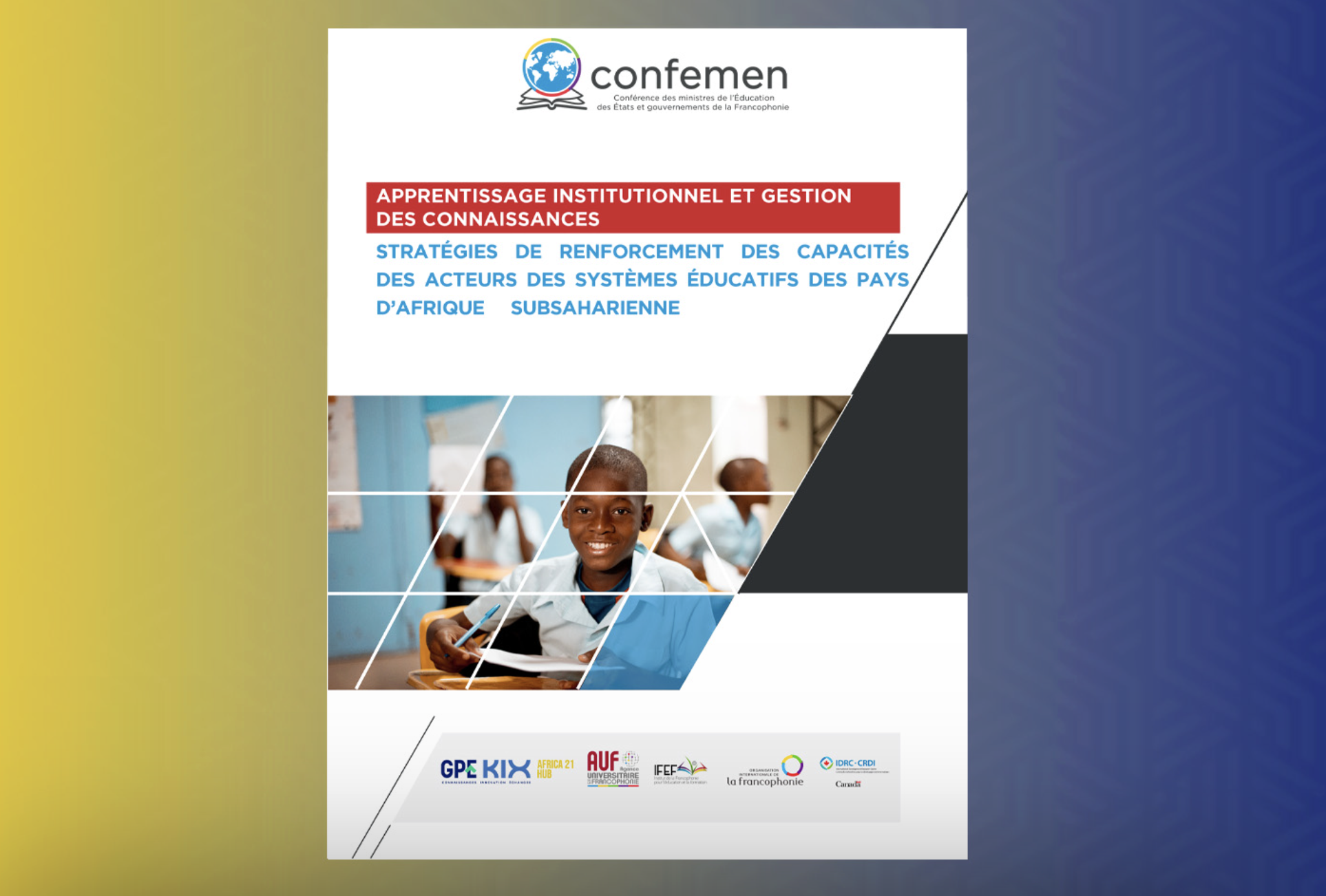 Le bassin de connaissances issue de recherche en éducation a une valeur inestimable. Ces recherches peuvent informer les pratiques éducatives, les approches pédagogiques et même les organisations institutionnelles. Toutefois, les enjeux relatifs aux transferts entre les connaissances issues de la recherche et les praticiens sur le terrain demeurent aussi persistants. Réduire le fossé entre les connaissances produites par le monde académique et gouvernemental et les praticiens en éducation s’impose comme un champ d’investigation incontournable. Afin de palier à ses difficultés, l’Organisation Internationale de la Francophonie (OIF) à travers son Institut de la Francophonie pour l’Éducation et la Formation (IFEF), la Conférence des ministres de l’Éducation des États et gouvernements de la Francophonie (CONFEMEN) et l’Agence Universitaire de la Francophonie (AUF) a mis en place le centre KIX Afrique 21 afin d’approfondir la compréhension des innovations réussies tant au regard des produits, des processus, des stratégies que des approches permettant de rendre les systèmes éducatifs plus efficaces et à renforcer la capacité des gouvernements à innover, à générer et utiliser des données probantes. Cette étude propose donc de faire un état des lieux des pratiques d’apprentissage institutionnel et de situer le transfert de connaissance en éducation dans les systèmes éducatifs des pays membres du centre KIX Afrique 21.